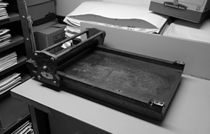 James Reaney’s Nolan proof press at The Porcupine’s Quill in Erin, Ontario